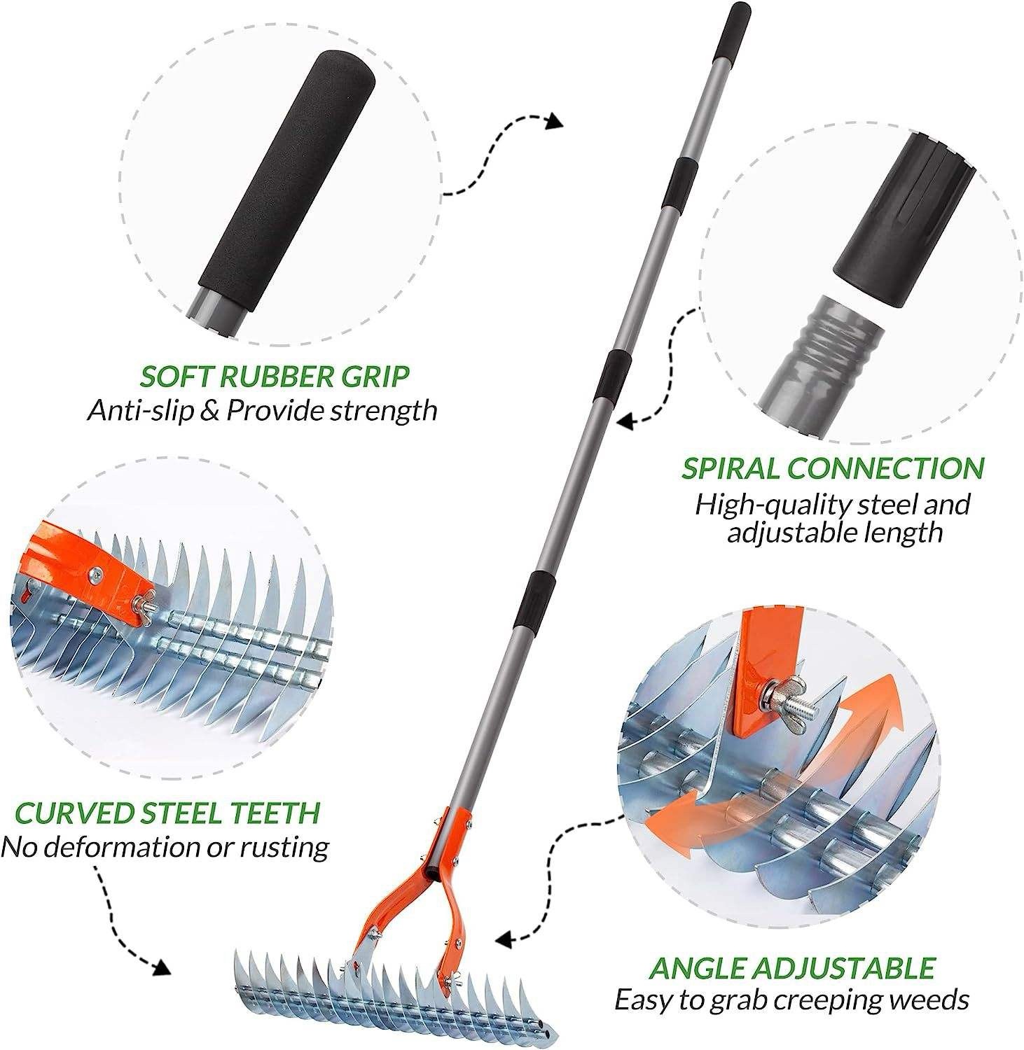 Magas minőségű, korrózió- és rozsdamentes bevonattal ellátott rozsdamentes acélból készült, így ez a gereblye hosszú távú kültéri használatra lett tervezve. Az állítható nyél hossza akár 1,3 m, ami különböző testmagasságú felhasználók számára is kényelmessé teszi az eszközt, a gumírozott, csúszásmentes markolat pedig biztosítja a kényelmet és az irányítást munka közben.