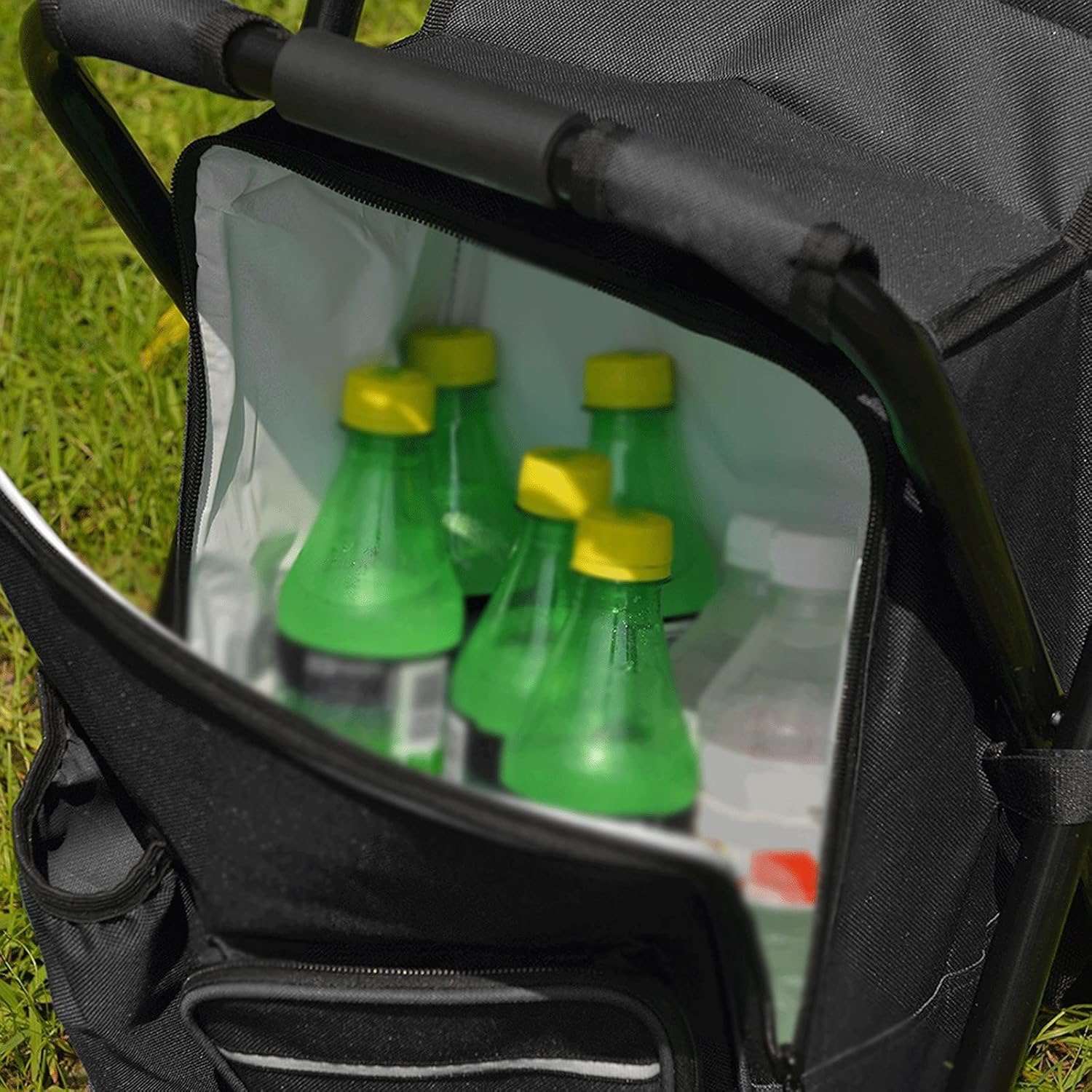 Erős Oxford szövetből, vízálló bevonattal és acél vázzal készült a tartósság és hosszú élettartam érdekében. A több különálló zsebben elférnek italos palackok, esernyő, kulcsok, pénztárca és egyéb szükséges holmik.